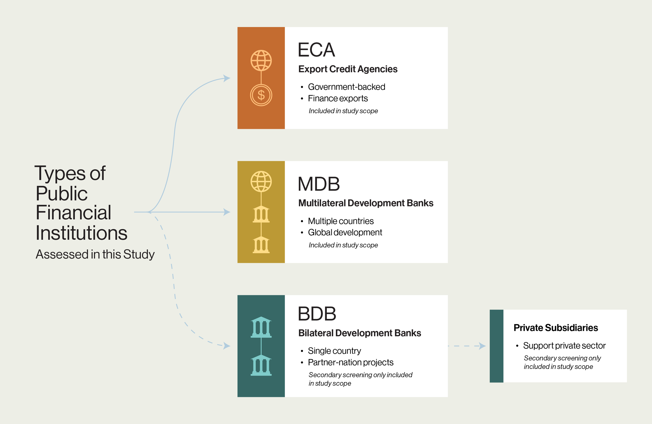 PFIs include multilateral development banks (MDBs), which are international banks funded by multiple countries to support development projects worldwide; export credit agencies (ECAs), which are government-backed institutions that fund export projects; and bilateral development banks (BDBs), which are funded by a single country to support projects in partner nations. The scope of this study focuses on MDBs and ECAs; BDBs were included in secondary screening, as well as their private subsidiaries (specialized arms that support private sector investment) (see Figure 1).