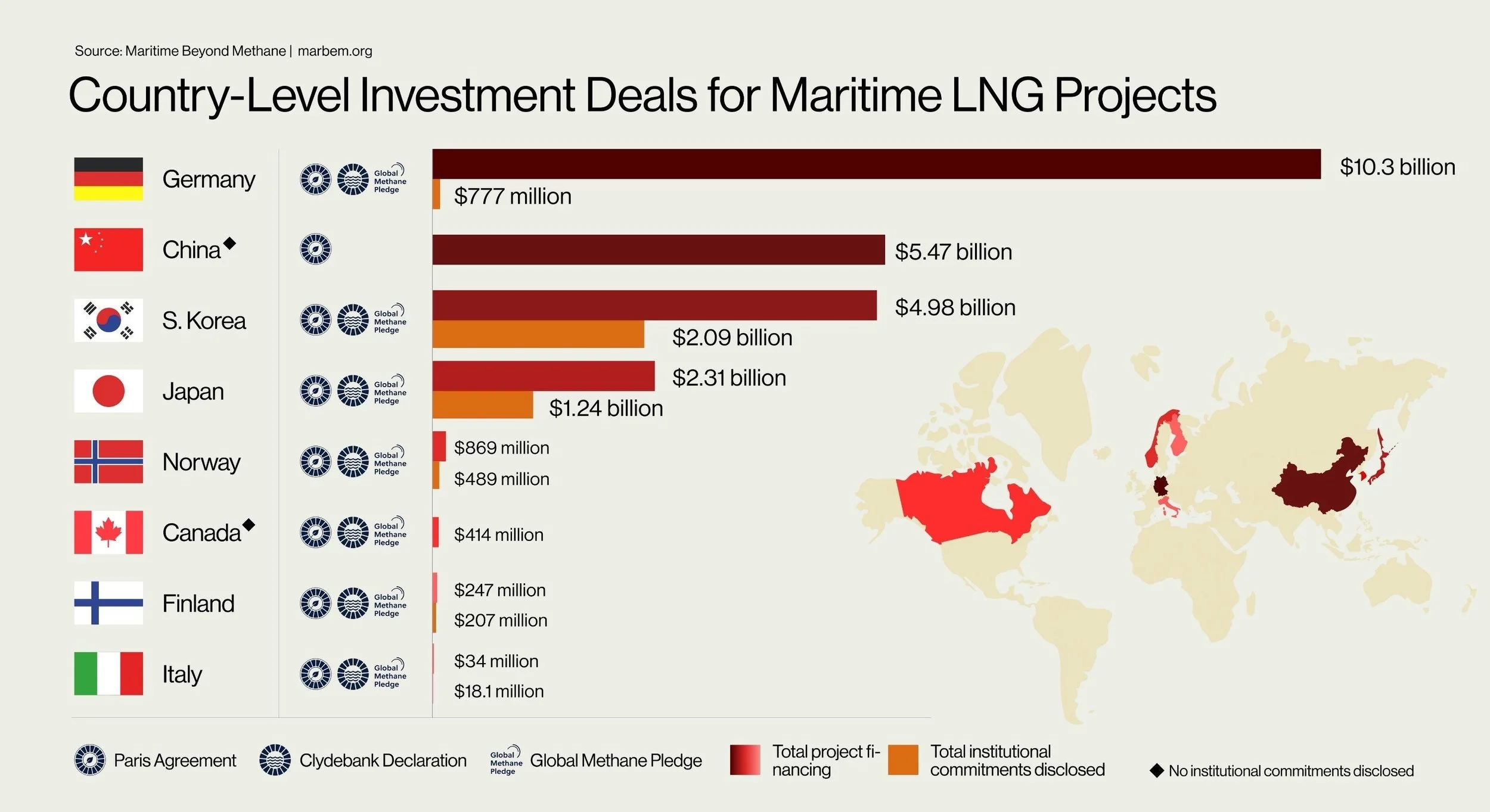 Backed by global finance tracking databases, this analysis traces over USD $21.9 billion directed towards maritime LNG projects (76 deals involving public finance institutions and their subsidiaries that contributed to 62 maritime LNG projects).