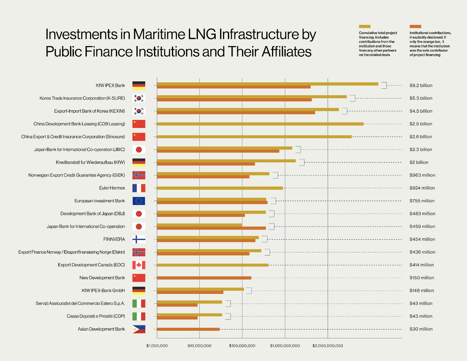 Figure 3. Investments (USD) in maritime LNG infrastructure by public finance institutions and their affiliates, illustrating both total project financing and each institution’s individual contributions. Values reflect each institution’s financial commitments at risk; projects financed by more than one institution are attributed separately to each contributor, and aggregated figures therefore exceed the total value of unique projects.